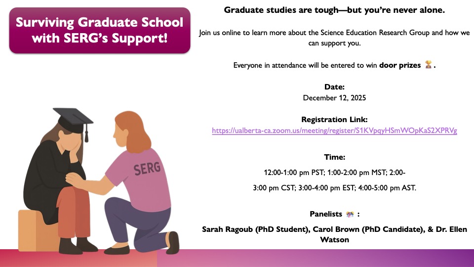 Join Canadian Science Education Research Group (SERG) for a free online panel discussion featuring past and current Canadian SERG members. Hear firsthand stories about how they navigated the challenges of graduate studies, the strategies that helped them succeed, and the lessons they learned along the way. Plus, everyone who attends will be entered for a chance to win one of two door prizes!